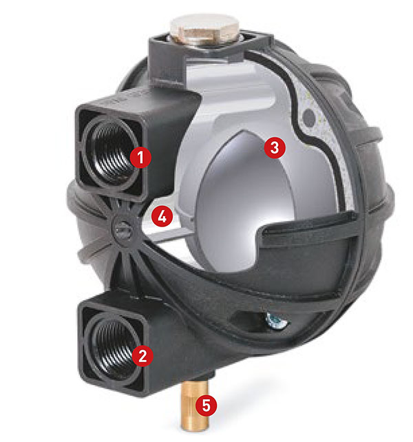 Increasing water level rise the floating buoyancy. When the condensate level is high enough the floater unblocks the discharge orifice and the condensate is purged out through G 1/2" output connection (2). When condensate level drops floater drops with it and blocks the discharge orifice. This operation prevents air loss.