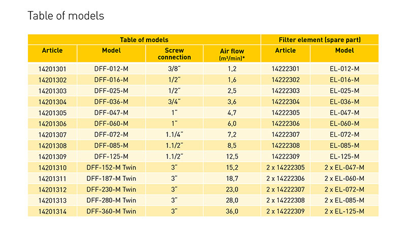 | Filter type | Micro-filtration aerosols of oil & water, solid particles |
