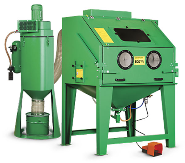 All-welded blast cabinet, assembled ready to use with hopper mounted suction blast system, GX manual blast gun, GXT-8 tungsten carbide nozzle, lined rubber gloves RGS-600, pneumatic pilot operated control valve, foot valve with remote control hoses, air filter with manual drain valve, freestanding cartridge dust collector DC-370 with manual cartridge cleaning, filter cartridge, suction hose.