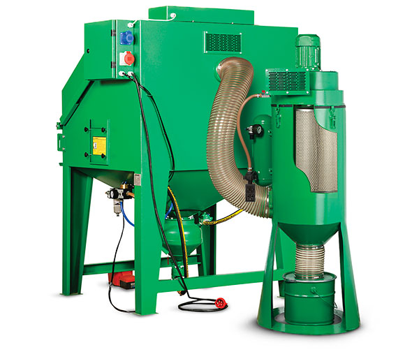 All-welded blast cabinet, ready to use assembled with hopper mounted pressure blast system, NTC-5 tungsten carbide nozzle, lined rubber gloves RGS-600, pneumatic pilot operated control valve, foot valve with remote control hoses.